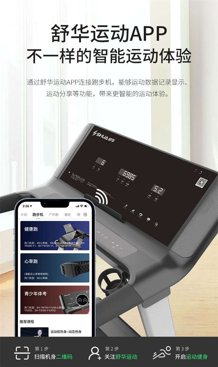 舒华I5智能家用跑步机是由舒华体育联合中国体育科学学会、上海体育大学运动科学学院教授陆大江等权威机构、专家共同研发设计。独特之处在于它结合国际科学跑步研究理论,能够针对不同用户进行运动能力测试,并根据测试结果生成因人而异的有氧运动处方。这意味着每个用户都能得到一个适合自己的运动方案,从而更好地达到运动效果。这一创新技术可以确保用户在运动过程中能够保持在最佳的区间状态,从而提高运动安全性和有效性。